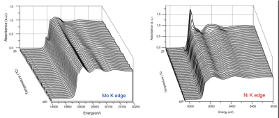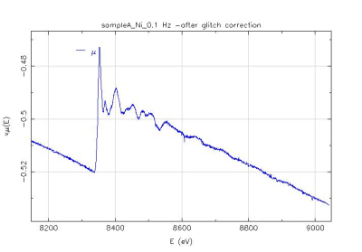 Ni K edge XAS signal (up) collected in a TEY detection mode on a Proton Exchange Membrane Fuel Cell thick film in the Quick-EXAFS mode after correction of glitches. The presented spectrum is not averaged (5s of time acquisition).The frequency of oscillation of the Si(111) channel-cut was 0.1 Hz (5s per spectrum) with an oscillation amplitude of 1.6°.