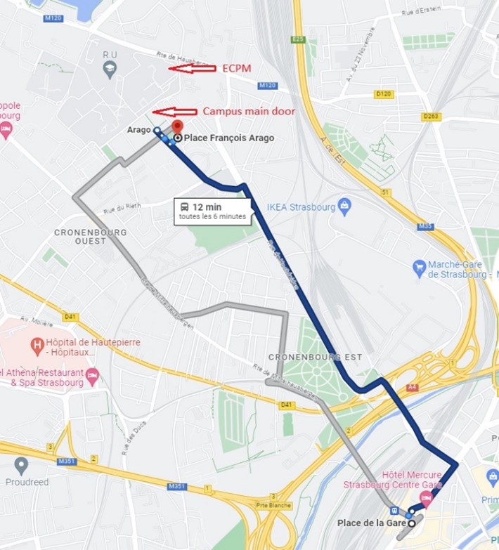 - Approximately 500m after a railway bridge, take the third street on the right. A sign on the right will indicate Campus de Cronenbourg, rue du Loess.