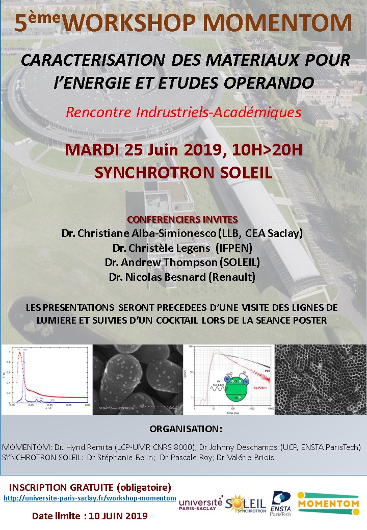 MOMENTOM* organizes its fifth workshop of industrial-academic meetings on the theme "Materials for energy: characterization and in operando studies", next 25th June at Synchrotron SOLEIL.