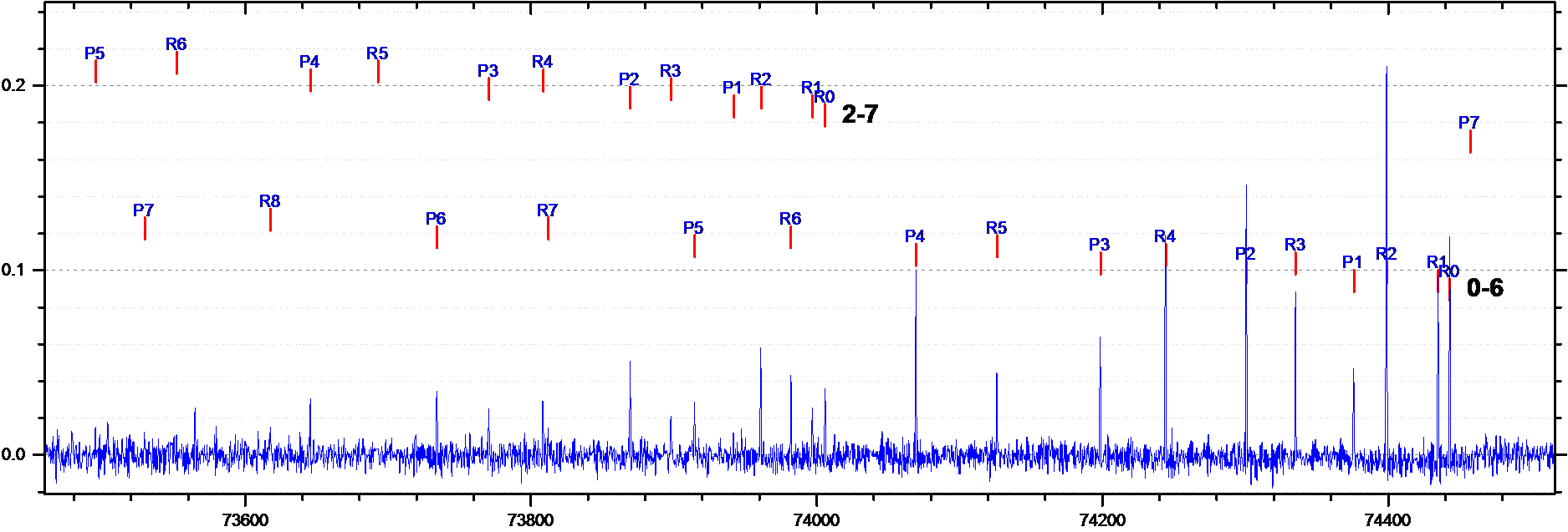 Figure 2 displays a typical absorption spectra obtained in D2 plasma facing a tantalum surface. On this rotational spectrum, the P and R branches are observed for transitions 0-6 up to J'' = 8. P and R transitions are used to determine the vibrational populations of the ground state to which the DA mechanism is sensitive.