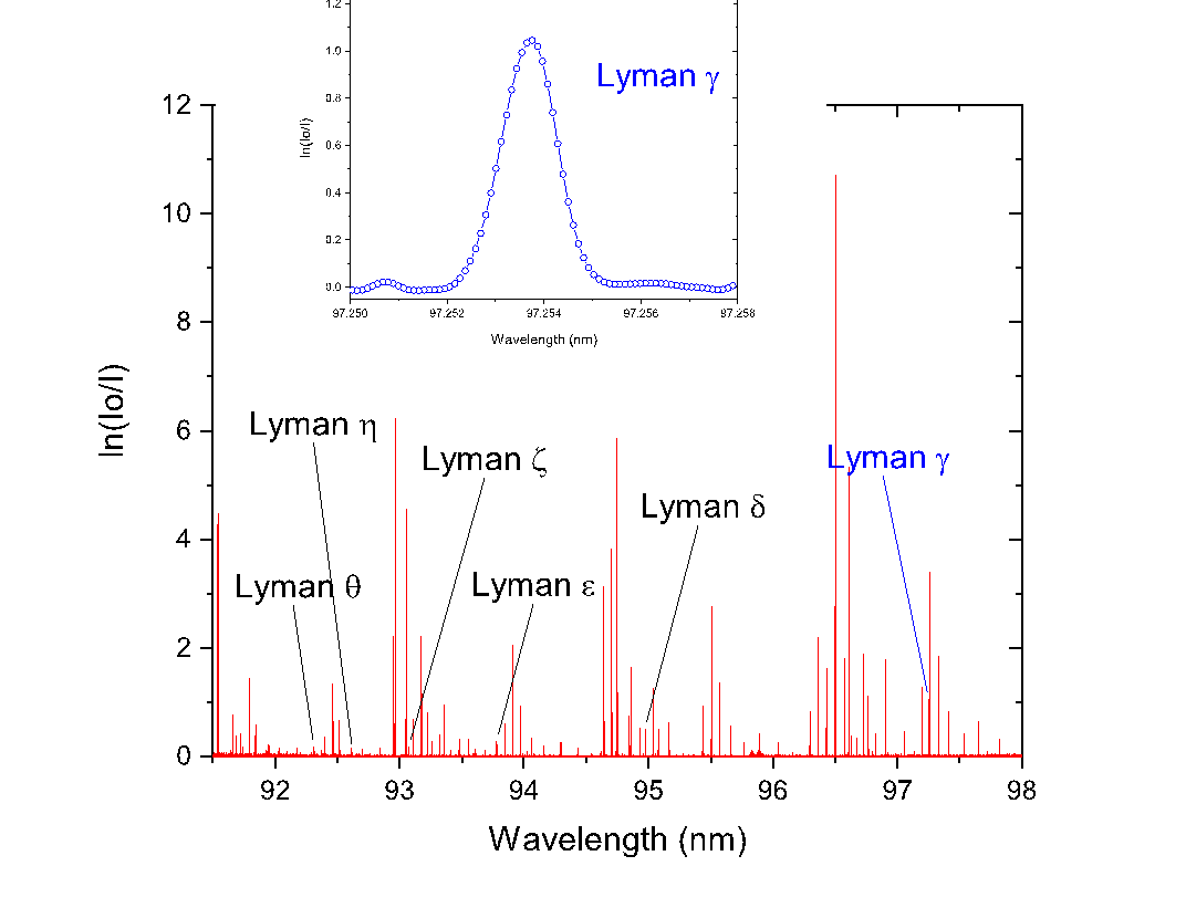 Moreover, in addition to the molecular transitions, the Lyman series of atomic transitions5 (see. fig. 3), from Ly-γ to Ly-θ (97.25 nm to 92.3 nm) were studied during the FTS measurements to obtain the absolute density of the hydrogen atoms and determine the absolute density of the different vibrational levels of the molecule in its ground state.