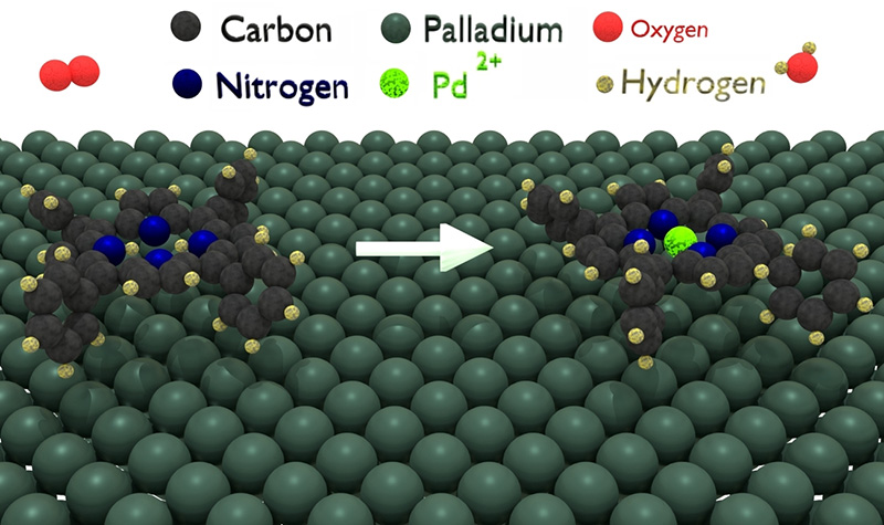 It was shown that self-metalation can be induced by gas phase oxygen already at room temperature. The measured activation energy barrier is only 0.37-0.4 eV. The pyrrolic hydrogen atoms react via the catalytic mediation of a Pd atom, thus forming molecular hydrogen (Figure 3). The same pyrrolic hydrogen atoms in the center of the molecule can be transferred to an oxygen atom, again via the catalytic mediation of a Pd atom, thus forming water. An alternative route involves the Pd(100) surface, which accommodates the H atoms after metalation and before desorption of the metalloporphyrin.