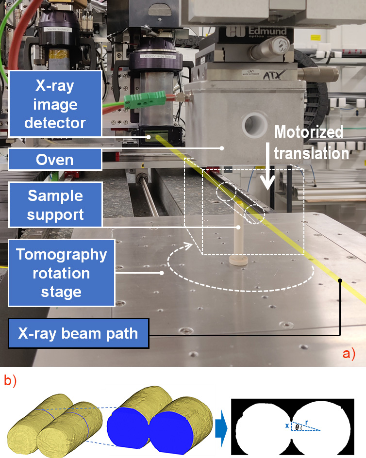 The thermomechanical properties of this biopolymer have been studied, but its fusion-adhesion abilities need to be measured in order to determine its suitability for 3D printing. To this end, an instrumented oven was designed to monitor in situ the viscous sintering of two juxtaposed filaments using X-ray micro-tomography at the SOLEIL Synchrotron on the ANATOMIX beamline, for temperatures ranging from 100 to 140 °C (Fig.1-a). The two extruded zein-based filaments are placed side by side on a flat aluminum support. Once the set temperature has been reached, the suspended oven is lowered around the sample holder, allowing a controlled rotation of the filaments and the acquisition of 3D tomography volume data during sintering, while the oven is not rotating.