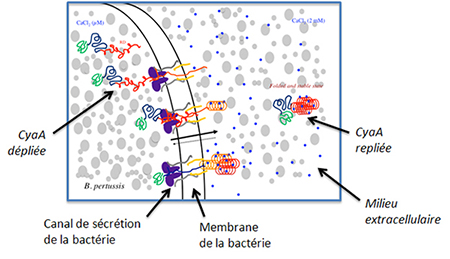 The elongated form of the unfolded state is favorable to the secretion of the protein (CyaA) through the bacterium secretion canal. The molecular congestion, represented with the grey objects, helps to maintain the protein unfolded in the bacterium (with a low calcium concentration), and to force its fold in the extracellular milieu (with high calcium concentration).