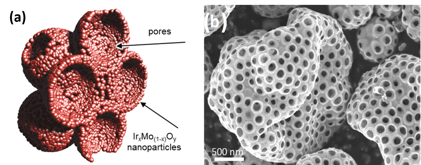 Inspired by their previous work on pure IrO2, researchers from ITODYS (University of Paris) and LCMCP (Sorbonne University) have produced a series of mixed oxides IrMOx (with M = Ti, Co, Mn, Mo), via an aerosol process, in order to obtain efficient catalysts while decreasing the amount of iridium involved. These mixed oxides are in the form of ultra-porous micron spheres whose walls are made of nanoparticles (fig. 1).