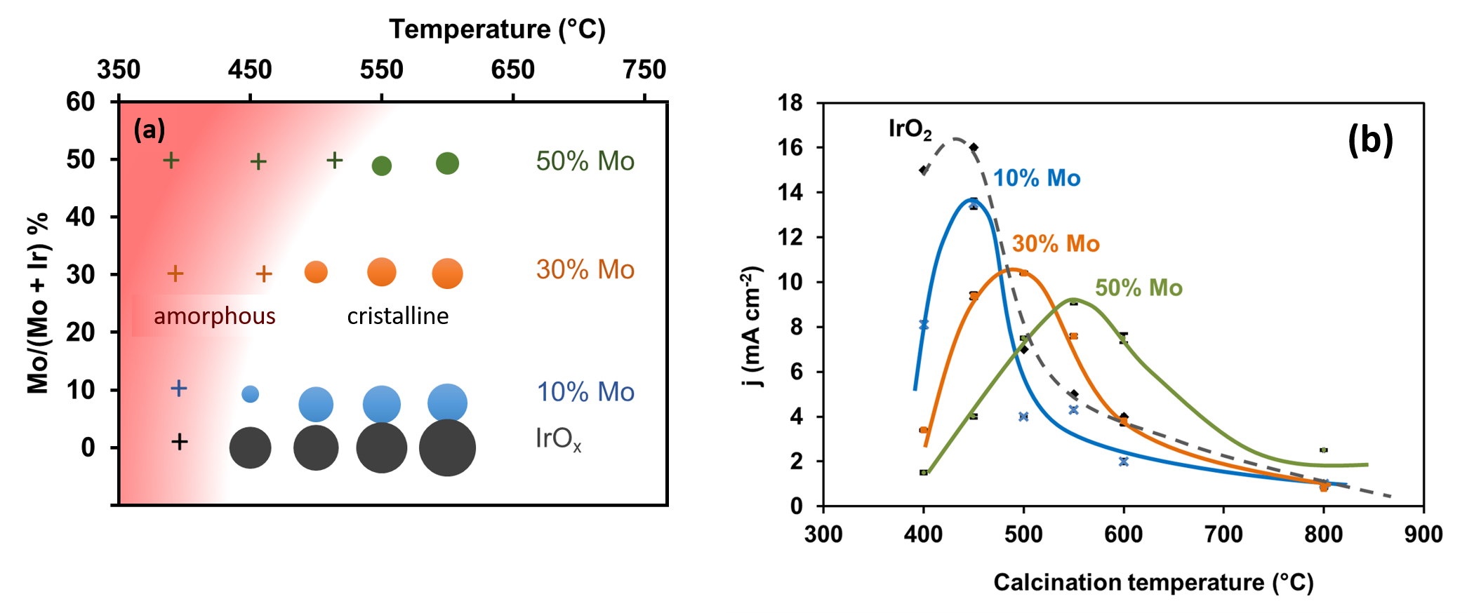 In the case of IrMoOx mixed oxides, the presence of Mo surprisingly induces a delay of crystallization, i.e. the temperature of crystalline-amorphous transition increases with the Mo content, beyond the 400-450°C range (fig. 2a). The electrochemical characterizations carried out in collaboration with the LCM of the Ecole Polytechnique (fig. 2b) indicate, moreover, that for a given Mo composition, the maximum activity corresponds precisely to the sample calcined at this transition temperature.