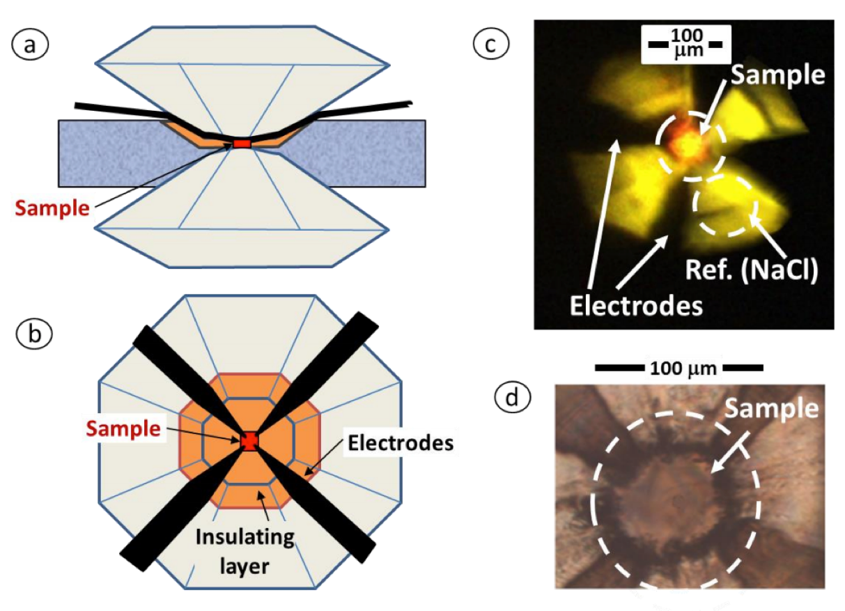 In that purpose, three groups (Pr. Timusk’s group, Hamilton, Canada, Pr. Eremets’ group and the team of AILES beamline) have collaborated to realize an optical study of this compound by infrared spectroscopy. In view of the complexity of the measurement, several problems had to be overcome. Firstly, the experimental setup used had to combine a control of the temperature just as the one of the pressure. Moreover, because of the use of a high pressure cell (Fig. 1a-b), the formed metallic sample is of the order of 50 micrometers. It implies that the spectroscopic study in reflectivity had to be made on a sample with a micrometric size (Fig. 1c-d). Finally, the expected spectral signatures being of the order of 3% of measured intensity, the system had to present a sufficient stability of measurement.