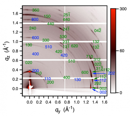 Figure 2: GIWAXS pattern with the incident x-ray beam aligned parallel to the electrodes (ω=0). The indexation indicates two main preferential orientations (in green and in blue) of the structure (monoclinic cell: a=33.7(3) Å; b=21.0(6) Å; c=9.7(0) Å; α=94.(5)°; β=γ=90°).