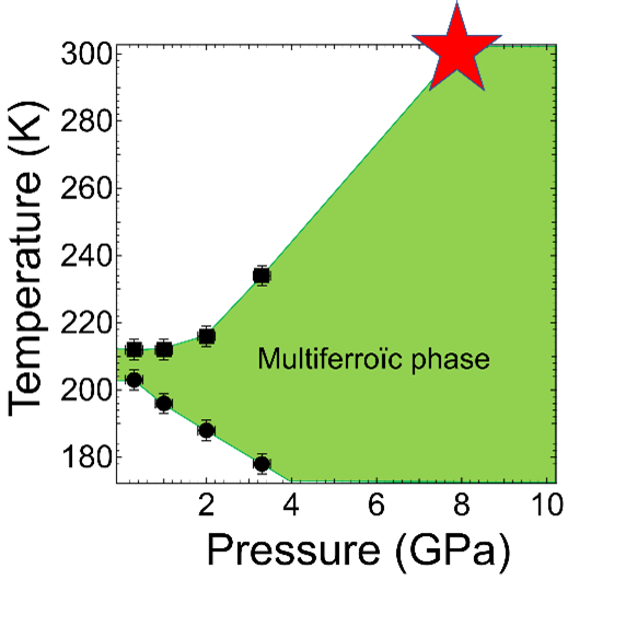When hydrostatic pressure is applied to a CuO sample, the strength of the electro-magnon, a characteristic excitation of the multiferroic phase, increases by an order of magnitude, and its temperature range expands by around 40 K. Extrapolation of these data predicts stabilization of the multiferroic phase at room temperature at a pressure of around 8 GPa (80,000 atm; see figure 3, red star).