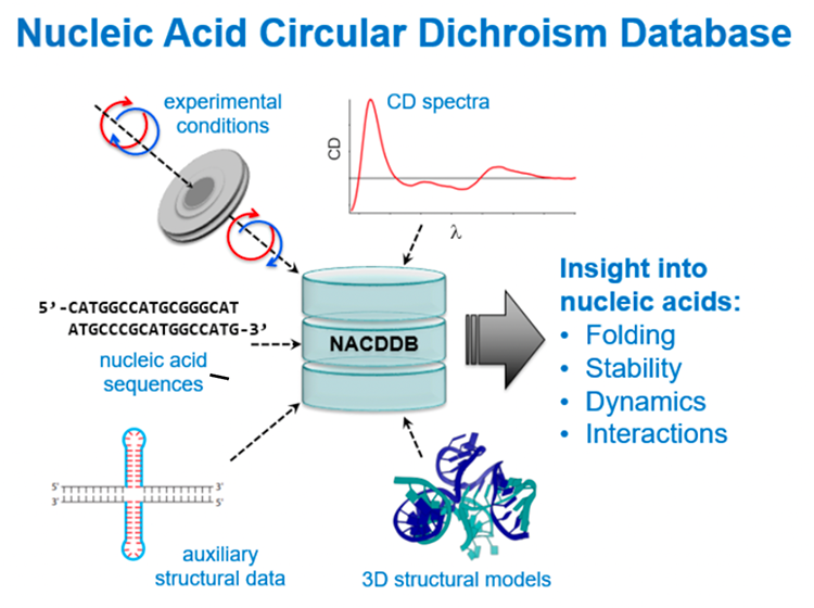 The database allows for searching, comparing, downloading and in future will allow to analyse CD spectra for nucleic acid structural arrangements. For known sequences with related high-resolution structures, 3D models are available too. The NACDDB is also open for submission of CD data from nucleic acids taken in structural-biology laboratories on top-bench spectrophotometers as well as on synchrotron radiation facilities providing SRCD.