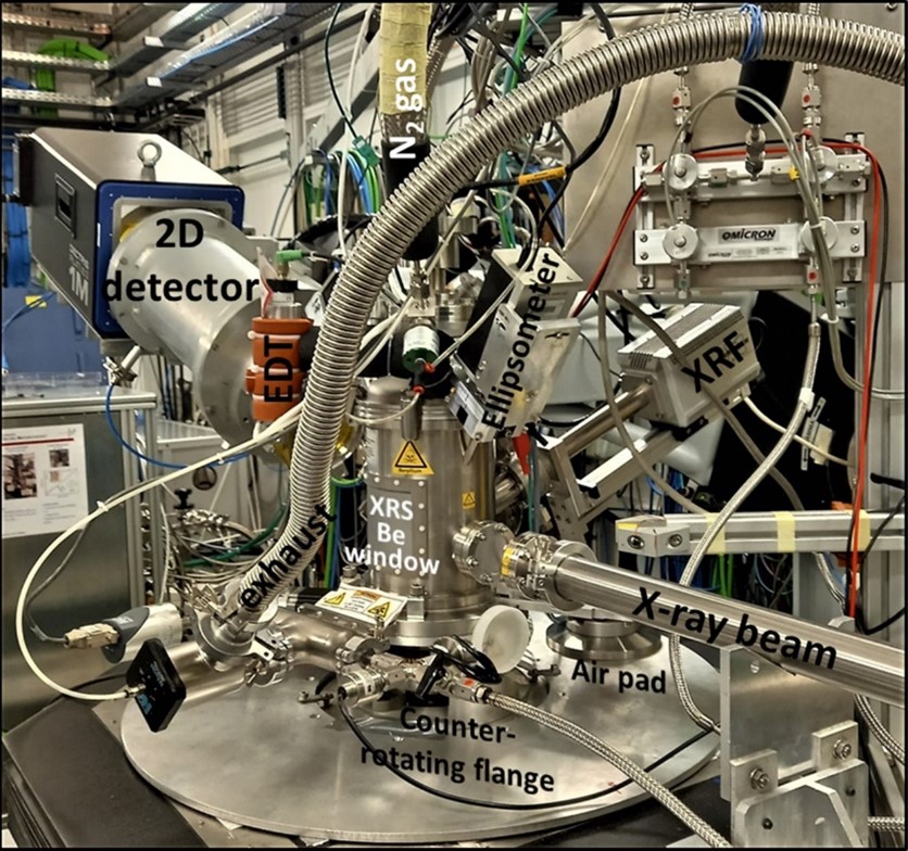 The set-up allows to use a complementary suite of in situ analysis techniques, i.e. x-ray reflectivity, x-ray fluorescence and absorption spectroscopies, as well as in-plane x-ray scattering.