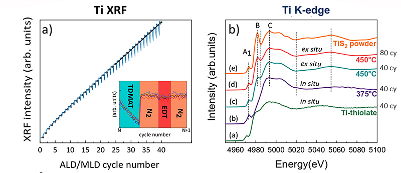 The unique features of the SIRIUS beamline allow the simultaneous recording of the X-ray fluorescence emission intensities of titanium and sulfur, allowing their respective contents to be monitored during the manufacturing process (figure 3). Similarly, the X-ray absorption spectra of Ti and S could be recorded from the early stages of film deposition, thus providing information on the evolution of the local atomic environment of the two atoms.
