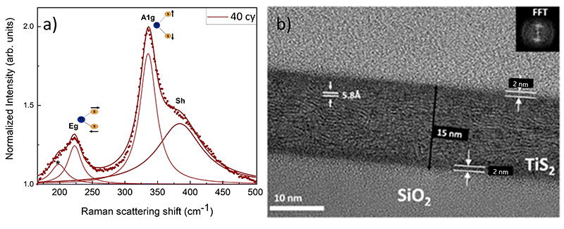 Upon thermal annealing the thin film transforms into TiS2 layers parallel to the SiO2 substrate surface (texture). The quality of the films was assessed by a combination of analytical techniques including X-ray absorption spectroscopy (Figure 3 (b)), Raman spectroscopy (Figure 4 (a)), transmission electron microscopy (Figure 4 (b)) and photoemission spectroscopy performed post-fabrication at CEA-Leti.