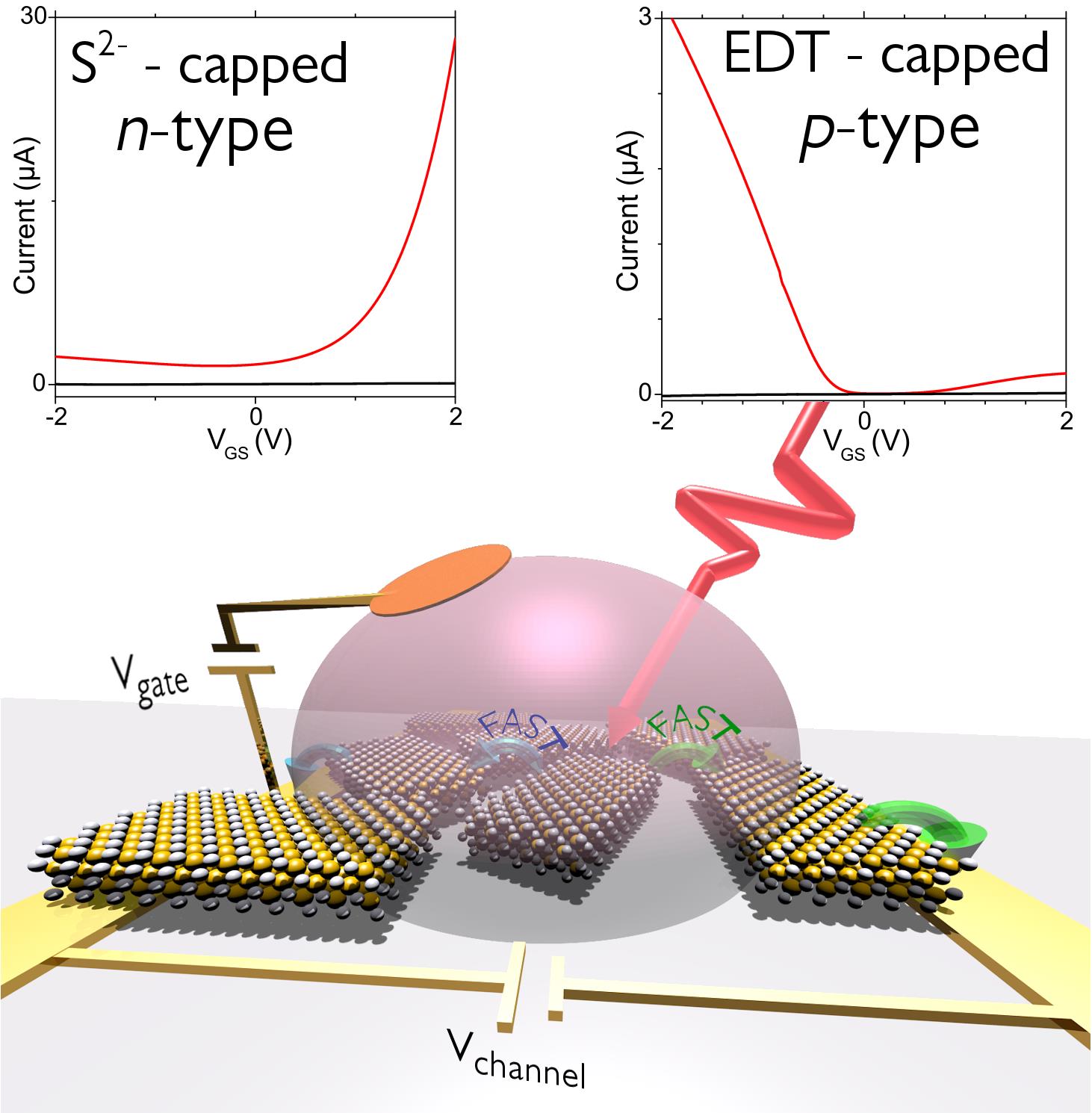 In this study, the authors used colloidal quantum wells (nanoplatelets) of HgTe recently synthesised by the group of Sandrine Ithurria at ESPCI in Paris. The 2D geometry leads to a perfect control of the thickness down to the single atom level and generates excitonic properties with no inhomogeneous broadening (i.e. the ensemble spectrum is the same as that of an individual particle). The challenge then is to make these materials conducting and photoconducting. This can be achieved by modifying the surface chemistry of the nanoplatelets. The authors have demonstrated that these changes not only increase the inter-particle coupling but also tuning the charge carrier density. To do this, the nanoplatelets are integrated in electrolytic transistors (Figure 1) and the material can either be a conductor of electrons (n-type) or holes (p-type) dependent on the surface chemistry used.
