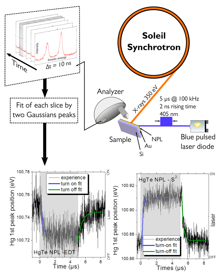 To do this, the authors used time-resolved photoemission on the TEMPO de SOLEIL beamline. Figure 2 is a schematic diagram of the experiment. This instrument gives access to the relaxation time of the majority and minority carriers. The typical times obtained are in the range of 100ns to 1µs (Figure 2, bottom) dependent on the surface chemistry used, which suggests that the current response times of the photo-transistors may still be reduced by three orders of magnitude by adapting the geometry of the devices.