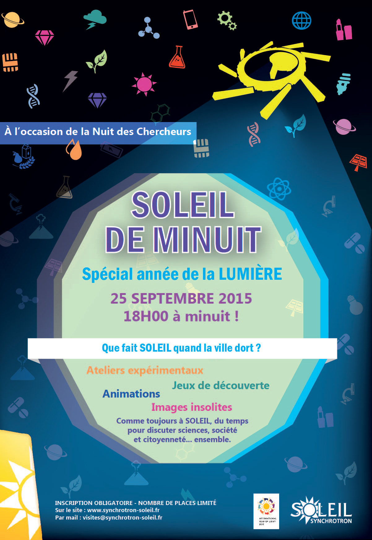 On the occasion of the Researchers' Night 2015, SOLEIL will open its gates and welcome the public on the 25th of September, from 6PM to midnight, for the third edition of its SOLEIL de Minuit.