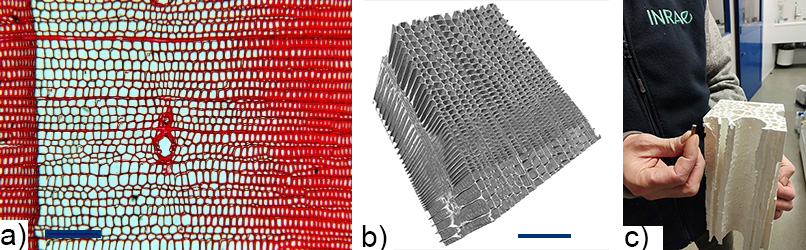 c) 3D model of the internal structure of an oak sample (held by Eric Badel, left), obtained by 3D printing from PSICHE X-ray microtomography measurements.