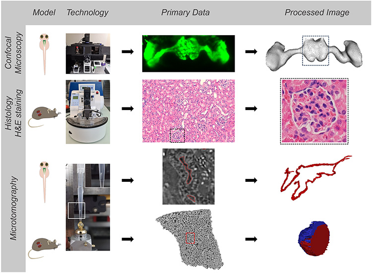 Figure 1: Schematic representation of the study design. A comparison between confocal microscopy and X-ray microtomography of zebrafish larvae and mouse kidney biopsies reveals similar effects of the nephrotoxin gentamycin in these two species.