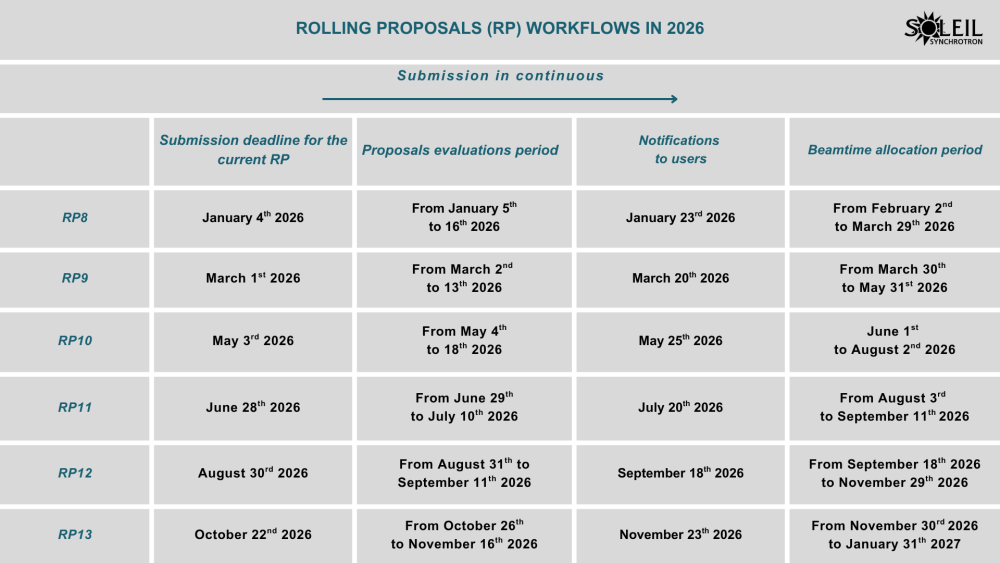 SOLEIL propose two calls for proposals per year and allocated beamtime is carried out during a 6 months period after peer-review committees decisions.