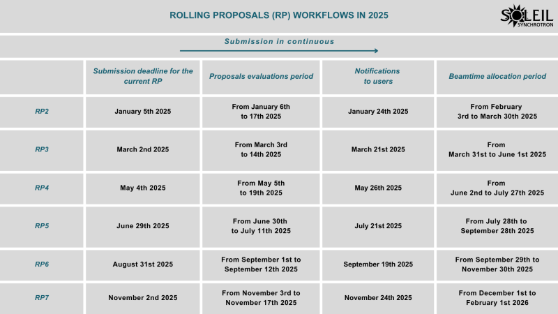 Rolling proposal with reviewing every two months for groups requiring beamtime for a single project.