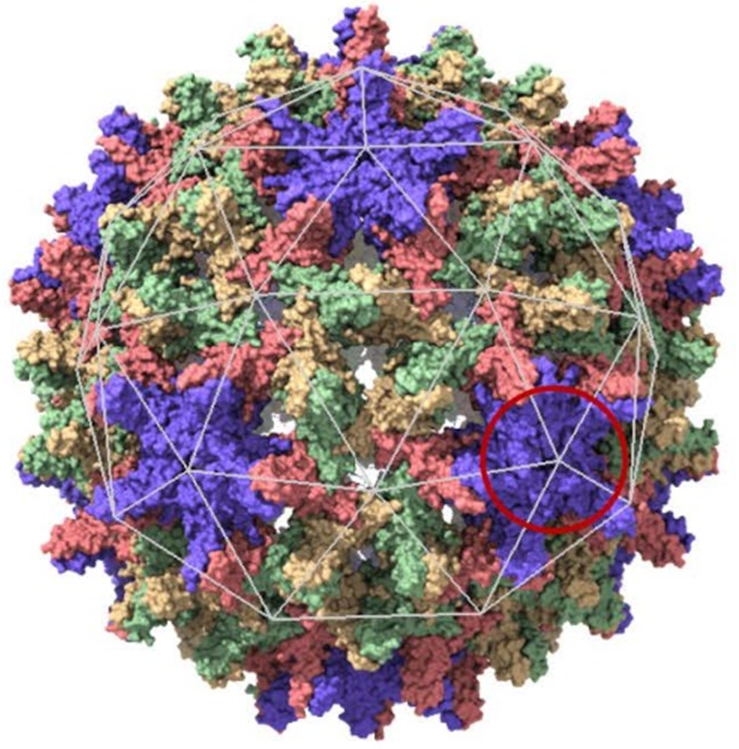 Plus de 250 millions d’individus sont infectés chroniquement par le virus de l’hépatite B (VHB), principalement en Afrique et en Asie du Sud, faute de vaccination systématique. VHB est à l’origine de pathologies sévères telles que la cirrhose du foie ou le carcinome hépatocellulaire conduisant chaque année à la mort de presque un million de patients. VHB est un virus enveloppé comprenant une coque de protéines – la capside – arrangée en une structure de symétrie icosaédrique (structure à 20 faces, Figure 1), protégeant le génome sous forme d’ADN. Lors d’un cycle de vie du virus, les sous-unités – une sous-unité étant un dimère de la protéine de capside – synthétisées par la machinerie de la cellule infectée s’auto-assemblent en capsides avant de franchir la membrane plasmique pour infecter les cellules voisines.