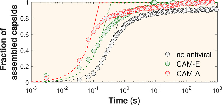 Des chercheurs de l’Université Paris-Saclay ont reproduit in vitro le processus d’auto-assemblage de la capside du VHB en présence de deux types de modulateurs d’assemblage dénommés CAM-E et CAM-A (CAM pour Capsid Assembly Modulator). Lorsque les protéines de capside virale purifiées, initialement conservées dans une solution à faible force ionique, sont brutalement placées dans une solution avec une force ionique physiologique d’environ 150 mM, elles s’assemblent spontanément pour aboutir à un mélange de capsides et de protéines non assemblées. Grâce à la technique de diffusion des rayons X aux petits angles résolue en temps (TR-SAXS) conduite sur la ligne SWING, les chercheurs ont suivi la cinétique d’auto-assemblage avec une haute résolution spatio-temporelle. La Figure 2 présente les fractions massiques de capsides assemblées en fonction du temps déduites des mesures par TR-SAXS. En utilisant un modèle cinétique de transition de phase, les énergies d’interaction entre sous-unités se sont révélées passer de 9kBT sans antiviraux – kBT étant l’énergie thermique – à 18kBT en présence de CAM-A, ce qui signifie que l’interaction entre les protéines formant la capside deviennent deux fois plus fortes en présence de cet antiviral.