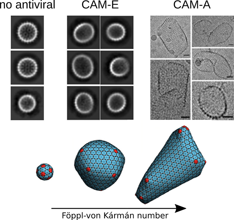 Les objets finaux ont été imagés par cryomicroscopie électronique en transmission (cryoTEM) et se sont avérés être soit légèrement ellipsoïdaux en présence de CAM-E, soit très fortement déformés et de plus grande taille avec CAM-A qu’en l’absence d’antiviraux (Figure 3).