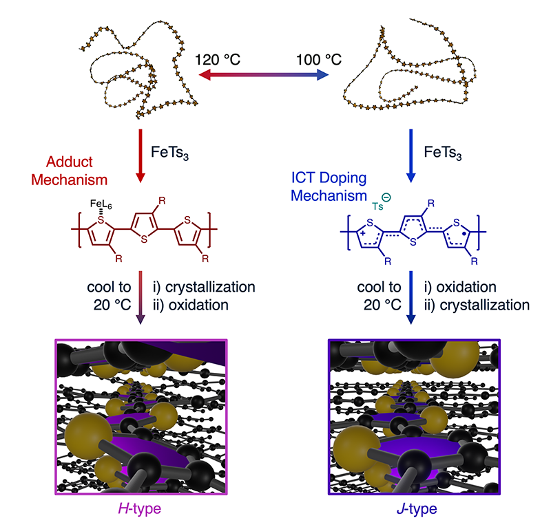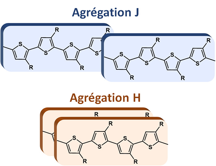 Des chercheurs des Universités de Toronto et d’Ottawa ont développé une méthode simple, robuste et accessible pour préparer des composants électroniques organiques à base de P3HT, un polymère conducteur électrique. Ces composants s’agrègent en faisceaux de nanofibres de plusieurs micromètres ou forment des nanoparticules de 20-40 nm selon leur état d'agrégation (J/H, cf. figure 1). Afin d’améliorer leur conductivité, ces matériaux doivent être dopés, en général par l’ajout de Fer III. Les conditions et le niveau d’un tel dopage oxydant (concentration d’agent dopant, température de réaction) peuvent permettre d’ajuster à la fois les états électroniques, la stabilité colloïdale et l’auto-assemblage des nanostructures de polymères.