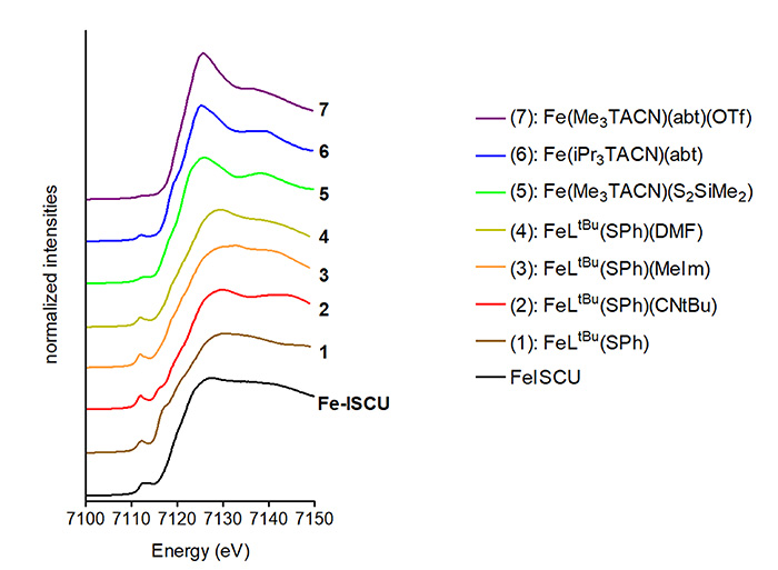 Grâce à l’ensemble de ces résultats, il apparait que le fer se fixe dans le site d’assemblage pour initier l’assemblage des clusters Fe-S. La détermination de la structure du site à fer par spectroscopie d’absorption X ouvre aujourd’hui la possibilité d’étudier plus finement le mécanisme d’insertion du soufre et au final de formation des centres Fe-S.