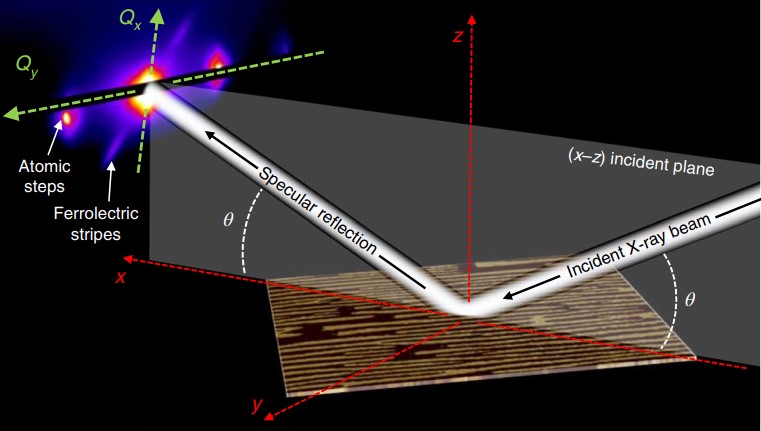 Les mesures REXS dichroïques au seuil K de l'oxygène révèlent d'abord la chiralité de l'ordre ferroélectrique grâce à l'inversion du contraste dichroïque. La diffusion des rayons X magnétiques au seuil L du fer révèle l’ordre magnétique et la présence de deux cycloïdes hébergées dans chaque domaine ferroélectrique et se propageant dans des directions alternées. Ces mesures dans l’espace réciproque (Figure b - gauche) sont corroborées par la magnétométrie NV à balayage qui donne une image dans l’espace réel (Figure b - droite) et les simulations. Grâce au flux élevé de photons, le motif diffracté révèle également la présence de bulles chirales antiferromagnétiques périodiques formées par la couture de cycloïdes antiferromagnétiques aux parois des domaines ferroélectriques.