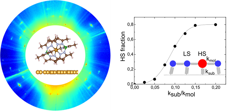 Afin de mieux comprendre le rôle du substrat sur la transition thermique des molécules d’un état magnétique à haute température vers un état non-magnétique à basse température, un modèle mécano-élastique simple a été développé prenant en compte les interactions molécules-molécules et molécules-substrat sous la forme de ressorts (respectivement appelés kmol et ksub). Il a ainsi été possible de montrer qu’il existe une gamme de paramètres pour lesquels à basse température une partie des molécules est stabilisée dans l’état magnétique (dit haut spin, HS). La figure de droite présente en particulier l’évolution de la proportion de molécules dans l’état magnétique (HS fraction) en fonction du rapport des constantes de ressort (ksub/kmol). Il est ainsi possible de voir qu’il existe une gamme de rapport (ici inférieur à 0.05) pour laquelle les propriétés des molécules ne sont pas affectées par la surface, c’est-à-dire que les molécules sont dans un état non-magnétique comme attendu en volume à basse température. Au-delà, l’état magnétique est stabilisé du fait des contraintes épitaxiales et il est possible d’observer la coexistence des deux états même à basse température.