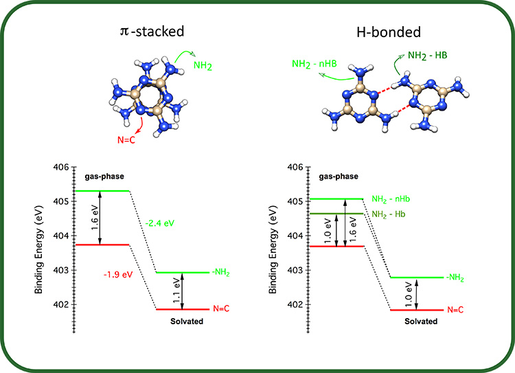 Ensuite, les spectres XPS de l’élément N de la mélamine ont été calculés en phase gazeuse et en phase liquide pour les dimères identifiés lors de la première étape de simulations. Ainsi, l'effet de la solvatation sur chaque type de groupe fonctionnel contenant N (NH2 et N=C) a pu être analysé. Les dimères π-empilés présentent des spectres, presque identiques à ceux du monomère, dans lesquels le déplacement chimique entre les niveaux d’énergie pour le amino-N (NH2) et le triazine-N (N=C) diminue notablement : de ∼1,5 eV en phase gazeuse à ∼1,0 eV en solution (partie droite de la figure 1). Une analyse plus détaillée révèle que, lors de la solvatation, l’énergie de liaison correspondant à chaque type d’atome N de la mélamine diminue, et celle de l’amino-N diminue nettement plus que celle du triazine (partie gauche de la figure 2).