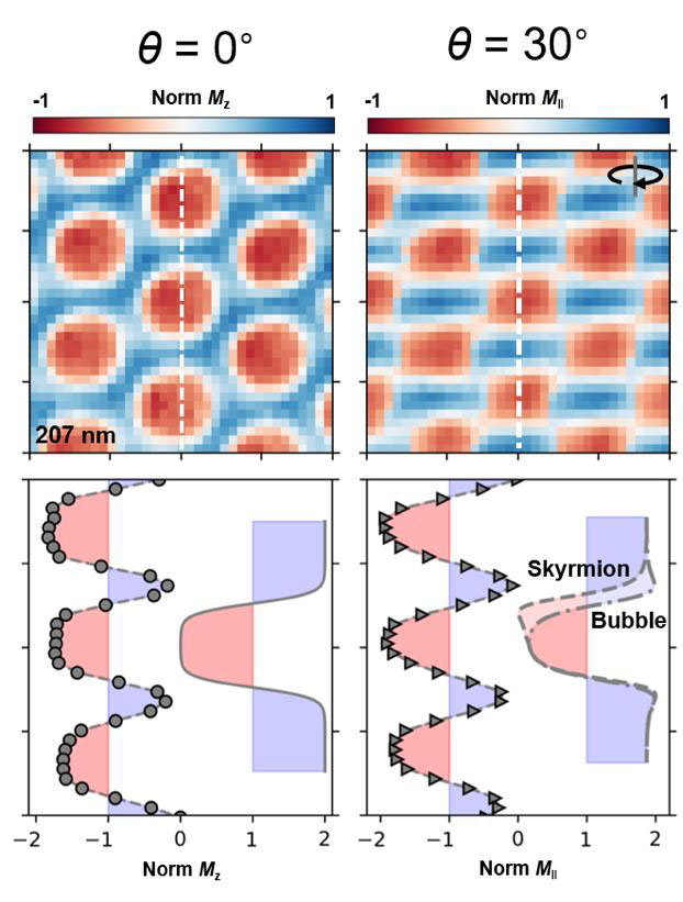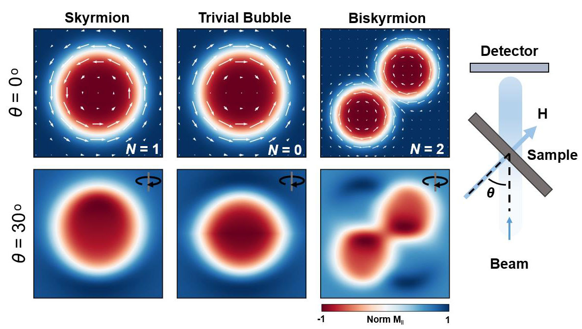 Ces résultats publiés dans la revue ACS Nano prouvent que ces biskyrmions pourraient ne pas exister, ce qui suggère que les publications précédentes auraient mal identifié des bulles magnétiques isolées. Cette étude a utilisé l'imagerie holographique avec des géométries d'échantillon inclinées pour cartographier la chiralité des parois de domaine formant ces domaines-bulles et déterminer leur structure topologiquement qui se révèle être triviale.