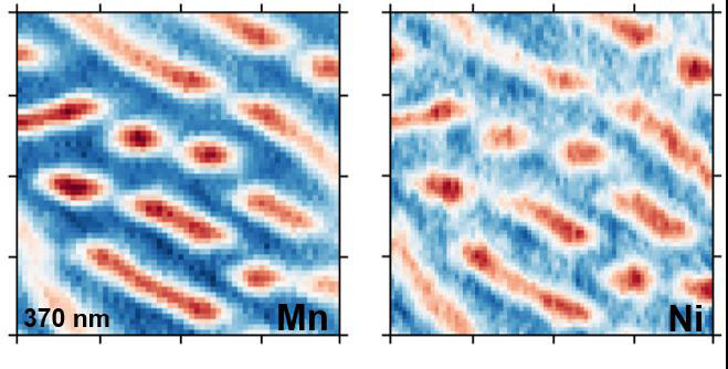 Les chercheurs ont utilisé l’imagerie holographique à transformée de Fourier sur la ligne de lumière SEXTANTS pour produire des images de rayons X à très haute résolution des textures magnétiques contenues dans un alliage ferromagnétique centrosymétrique MnNiGa. Le contraste magnétique de telles images est obtenu en accordant l'énergie (correspondant à un niveau d’absorption X du matériau) et la polarisation du faisceau de rayons X en exploitant un phénomène nommé dichroïsme circulaire magnétique (XMCD). Ceci permet ainsi de réaliser une imagerie à l’aimantation spécifiques des atomes de l’alliage, ce qui a permis dans cette étude de montrer que l'ordre magnétique des sous-réseaux Mn et Ni était mutuellement ferromagnétique (Figure 2). Ces résonances spécifiques aux éléments sondés se situent à différentes énergies. Grâce à la haute résolution spatiale accessible sur la ligne de lumière SEXTANTS, il a ainsi été possible d’observer le changement dans les résolutions spatiales des images qui correspond à une différence de longueurs d'onde de rayons X. Ainsi des résolutions spatiales de 23 ± 4 nm sur le seuil Mn-L3 et de 17 ± 4 nm sur le seuil Ni-L3 ont été obtenues. La différence de résolution spatiale est directement visible dans la figure 2.