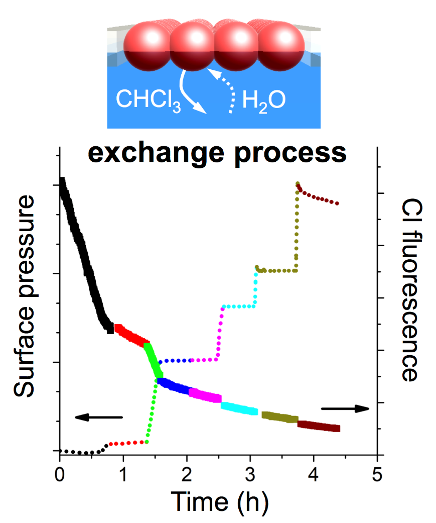La ligne de lumière SIRIUS de SOLEIL est l’une des rares installations au monde permettant la caractérisation in situ de monocouches à l'interface air-eau. Dans cette étude, la diffraction de rayons X en incidence rasante (GIXD) a prouvé que les nanoparticules maintiennent leur cristallinité interne lors de la formation de couches 2D denses et homogènes et la diffusion de rayons X aux petits angles en incidence rasante (GISAXS) a montré qu’elles s’organisent entre elles (Figure 1). En outre, la technique de fluorescence des rayons X en réflexion totale (TXRF) a été utilisée pour étudier la cinétique d’échange du chloroforme à l'interface air-eau. Les expériences réalisées confirment que le signal Kα du chlore provenant du chloroforme retenu initialement à l'intérieur des particules diminue en continu pendant la formation de la couche (Figure 2). Un modèle bi-exponentiel a été utilisé pour analyser les données expérimentales. Il est caractérisé par un temps caractéristique court (τ1) et un autre significativement plus long (τ2), imputables respectivement au procédé d'échange de solvants du chloroforme faiblement liées puis à l’élimination progressive des molécules de chloroforme fortement liées.