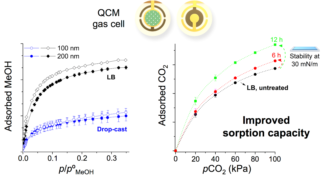 Les conclusions tirées de ce modèle ont permis d'optimiser l'activation des couches de LB de MOF qui nécessitent différentes durées d'échange selon la taille des nanoparticules. L'activation peut être réalisée in situ (des monocouches sont laissées à l'interface eau-air avant la décomposition de la couche) ou ex situ (des couches de LB déposées sur des capteurs de microbalance à Quartz (QCM) sont ensuite immergées dans de l'eau), ces deux méthodes produisant des valeurs d'adsorption du CO2 semblables. En outre, l’organisation de la couche obtenue par la méthode de LB augmente l'adsorption du méthanol par les couches par rapport à des méthodes plus simples telles que le drop-casting (Figure 3).
