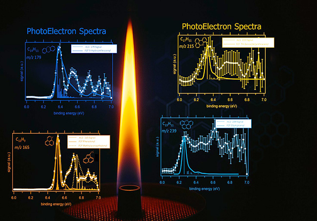 En couplant une flamme de méthane modèle au spectromètre à double imagerie de coïncidence photoélectron-photoion (i2PEPICO) disponible sur la ligne de lumière DESIRS, qui permet d’obtenir des spectres de photoélectrons (PES) sélectionnés en masse, ils ont observé et identifié directement ces radicaux aromatiques dans la zone de nucléation de la flamme, là où les particules carbonées prennent naissance. Il est à noter que les PES permettent aussi d’identifier des isomères à une masse donnée, un point crucial dans ces mélanges complexes.