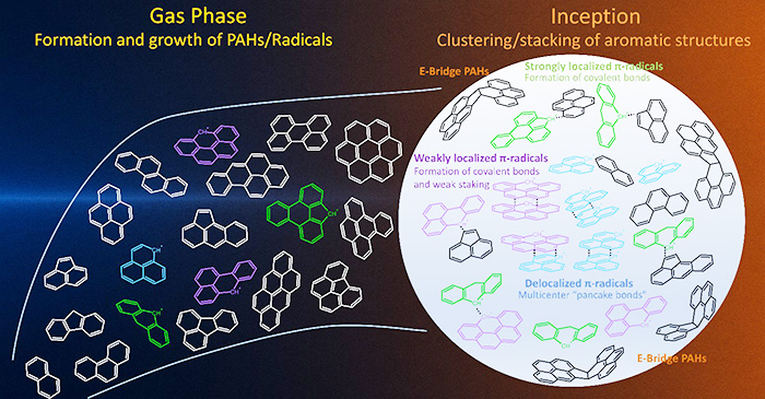De nouveaux indices laissaient penser que des radicaux aromatiques stabilisés par résonance pourraient jouer un rôle clé : ces molécules, à la fois stables et très réactives, seraient capables de s’associer entre elles et avec des HAPs sans détruire leur structure aromatique, formant ainsi les premiers agrégats carbonés.