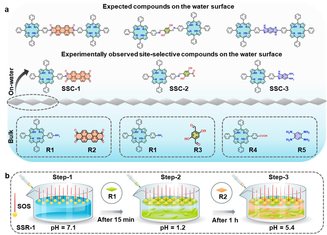 Des réactions sélectives à la surface de l'eau ont ensuite été démontrées pour trois réactions chimiques réversibles et irréversibles, formant des liaisons imide (SSC-1), imine (SSC-2) et 1,3-diazole (imidazole) (SSC-3) et impliquant des molécules de porphyrine (Fig. 1).