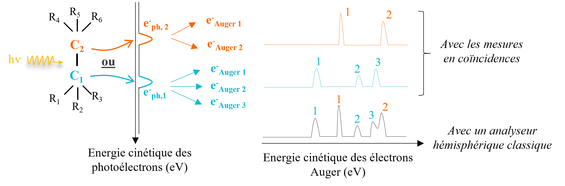 Pour favoriser la compréhension et par conséquent la distinction de chaque processus, deux conditions doivent être remplies. La première est d’arriver à identifier de façon claire la contribution des électrons du solvant et celle des électrons de la molécule en solution. La seconde est la distinction entre les différents processus Auger qui ont eu lieu suite à l'ionisation de plusieurs atomes au sein d'une même molécule. La méthode des mesures en coïncidences, dont le principe est représenté schématiquement sur la Figure 1, est particulièrement adaptée puisqu'elle permet de retrouver les paires d'électrons (ici e-ph / e-Auger) issues d'un même événement d'ionisation. Comme décrit sur la Figure 1, cette méthode donne accès à des spectres Auger filtrés selon une gamme d'énergie cinétique, ce que ne permet pas une mesure classique de spectroscopie électronique.