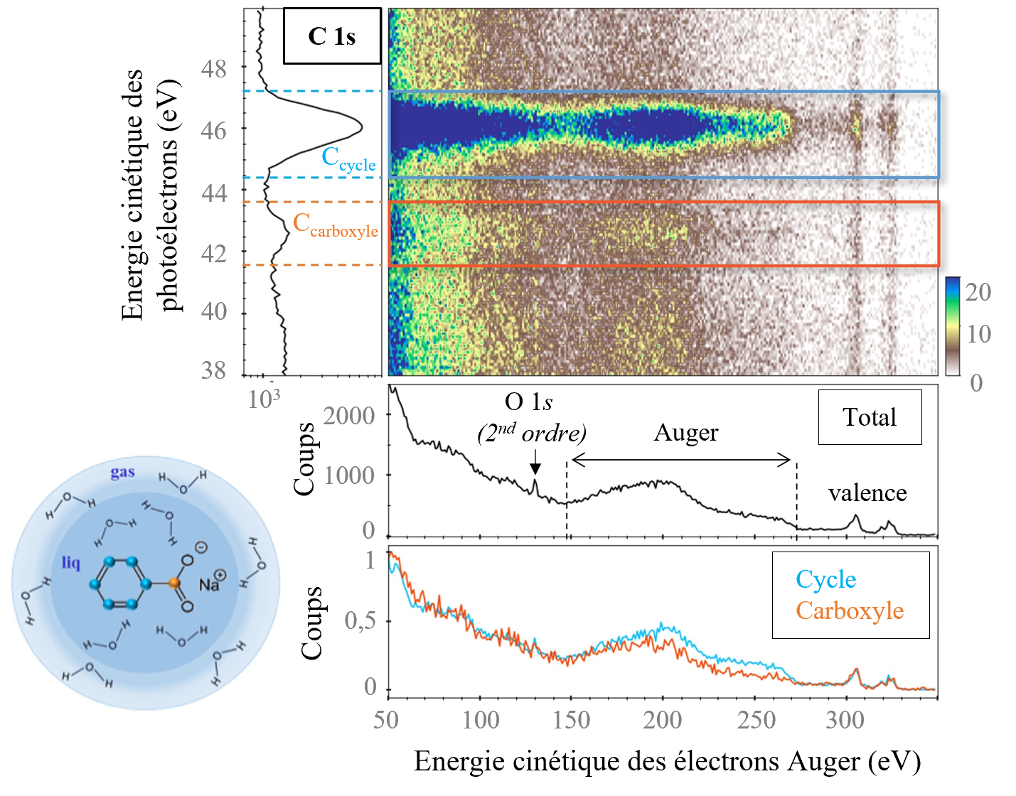 L'application de cette technique à un échantillon liquide implique la mise en œuvre d'un dispositif de micro-jet liquide. Les équipes de scientifiques ont combiné ces deux techniques pour étudier les molécules de benzoate de sodium solvatées dans l'eau, représentées schématiquement dans le micro-jet dans la Figure 2. Le benzoate de sodium est composé de deux groupements chimiques différents : le cycle aromatique dont les carbones sont identifiés par des sphères bleues et le groupement carboxyle dont le carbone est identifié par une sphère orange. Sur la ligne PLEIADES, les mesures ont été effectuées en utilisant des rayons X d’énergie supérieure au seuil de la couche électronique 1s de l’élément carbone. Les résultats obtenus sont présentés dans la Figure 2.