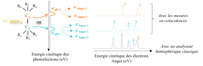 Figure 1 : Schéma du principe de la mesure en coïncidences pour une molécule avec deux carbones ayant des environnements chimiques non équivalents. On distingue deux processus Auger, chacun suivant l'émission de e-ph,1 ou e-ph,2.