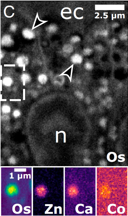 Les images du bas montrent que le zinc (Zn), le calcium (Ca) et le cobalt (Co) peuvent être détectés et imagés à la même résolution que l’Os dans les organites pigmentés, et cela malgré leur faible concentration.
