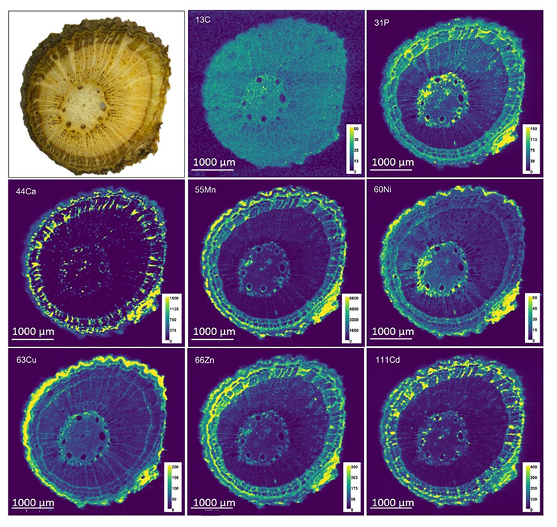 Sur la ligne de lumière SAMBA, l'environnement chimique du Cd a été mesuré dans différents organes des arbres par XANES (Figure 1). Associés à l'imagerie des sections transversales des branches (Figure 2, réalisée à la KU Leuven, Belgique), les résultats ont permis de comprendre les mécanismes utilisés par l'arbre pour accumuler et détoxifier le Cd.