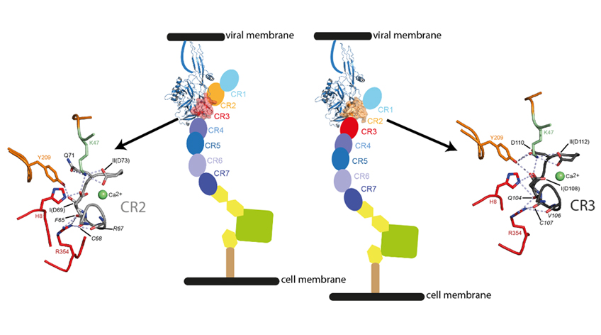 Il avait été montré que le récepteur des lipoprotéines de basse densité1 (LDL-R) et d’autres récepteurs de la même famille étaient des récepteurs du VSV. Des chercheurs du Département de Virologie de l’I2BC et de la ligne PROXIMA-1 viennent d’obtenir les structures de G en complexe avec deux domaines CR (pour Cystein rich) du LDL-R qui en contient sept. Les deux domaines occupent le même site de liaison. Deux acides aminés de G, essentiels pour la liaison des domaines CR, ont été identifiés : leur mutation abolit la capacité de G à lier son récepteur sans toutefois abolir ses propriétés de fusion virale. De façon remarquable, des virus pseudotypés2 avec de tels mutants de G ne sont plus infectieux.