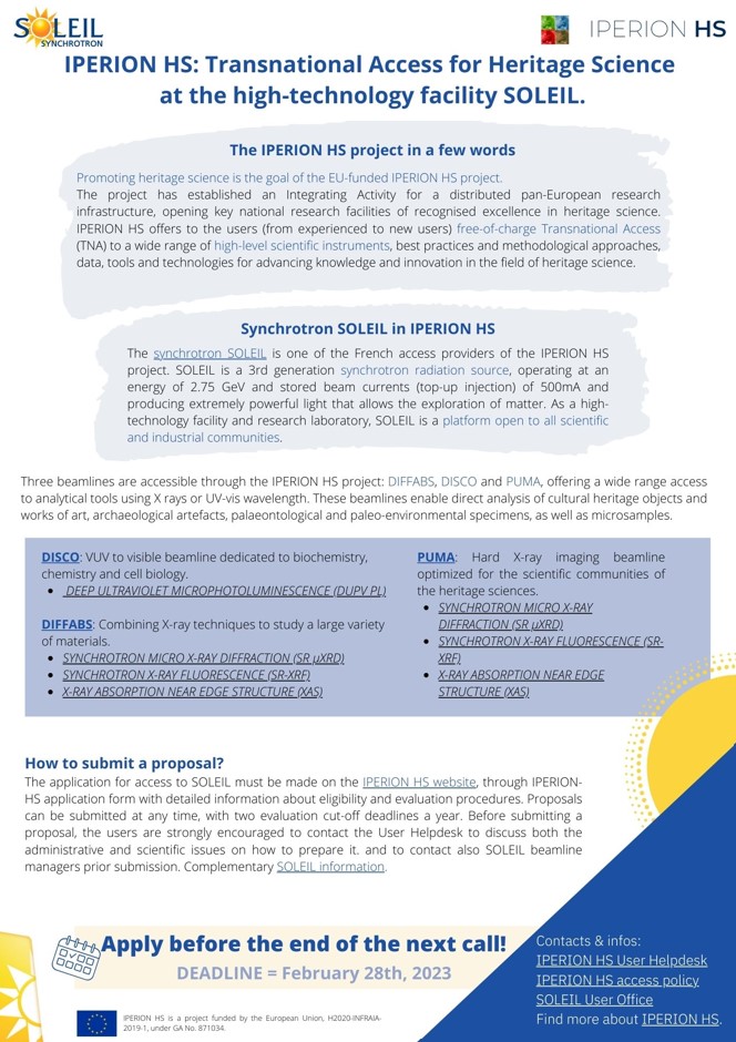 Le projet IPERION HS, financé par la Commission Européenne sous la convention de subvention n°871034, permet d'offrir aux utilisateurs européens l'accès à des infrastructures scientifiques de haut niveau, dans le domaine des sciences du patrimoine culturel. SOLEIL est tierce partie du CNRS dans le projet, offrant l'accès à trois lignes de lumière (DIFFABS, DISCO et PUMA). Ces lignes permettent l'analyse directe d'objets du patrimoine culturel et d'œuvres d'art, d'artefacts archéologiques, de spécimens paléontologiques et paléoenvironnementaux, ainsi que de micro-échantillons.