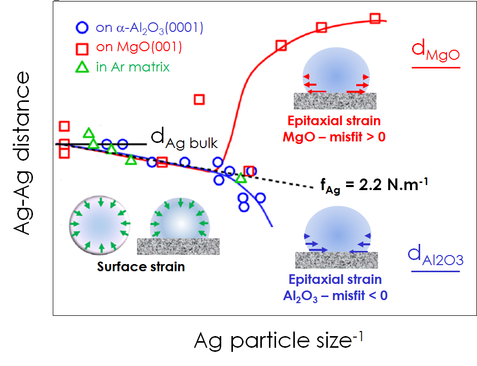La comparaison des trois séries de données EXAFS représentées sur la figure (les nanoparticules Ag/α-Al2O3(0001) étudiées ici (désaccord paramétrique négatif de -5 %), les nanoparticules Ag/MgO(100) analysées précédemment (désaccord paramétrique positif de 3 %) et les nanoparticules d'argent insérées dans l’argon) démontre une dépendance unique par rapport à la taille des nanoparticules d'argent au-delà d'une taille de 3 nm, qu'elles soient posées sur l'un ou l'autre des substrats. Les variations de distance Ag-Ag qui accompagnent les variations de taille des agrégats d'argent peuvent être représentées par une droite dont la pente fournit la contrainte de surface fAg = 2,2 N·m−1. Au contraire, pour les agrégats d'argent d'une taille < 3 nm, les valeurs de distance Ag-Ag ont tendance à compenser les désaccords paramétriques (cf figure).