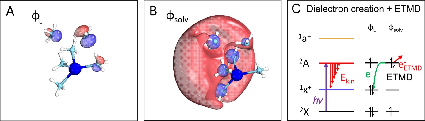 Lors d'une expérience récente sur les agrégats d'ammoniac dopés au sodium Na(NH3)n, réalisée avec le spectromètre de coïncidence électron/ion DELICIOUS III sur la ligne DESIRS, des scientifiques de SOLEIL, de l'université de Fribourg (Allemagne), de l'ETH Zurich (Suisse) et de l'université d'Auburn (États-Unis) ont induit la formation de diélectrons en utilisant la lumière UV/VUV pour transférer l’un des électrons d'une molécule d'ammoniac (voir figure 1A) vers un électron solvaté préalablement existant de façon isolée (voir figure 1B). Dans cet état excité, l'orbitale de l'électron solvaté est occupée par deux électrons appariés, c’est-à-dire un diélectron. La relaxation des paires d'électrons formées laisse une signature unique sur les spectres de photoémission d’électrons, lorsque l'un des deux électrons retourne vers la molécule d'ammoniac (le solvant), tandis que l'autre est éjecté du cluster d’ammoniac avec une faible énergie cinétique.
