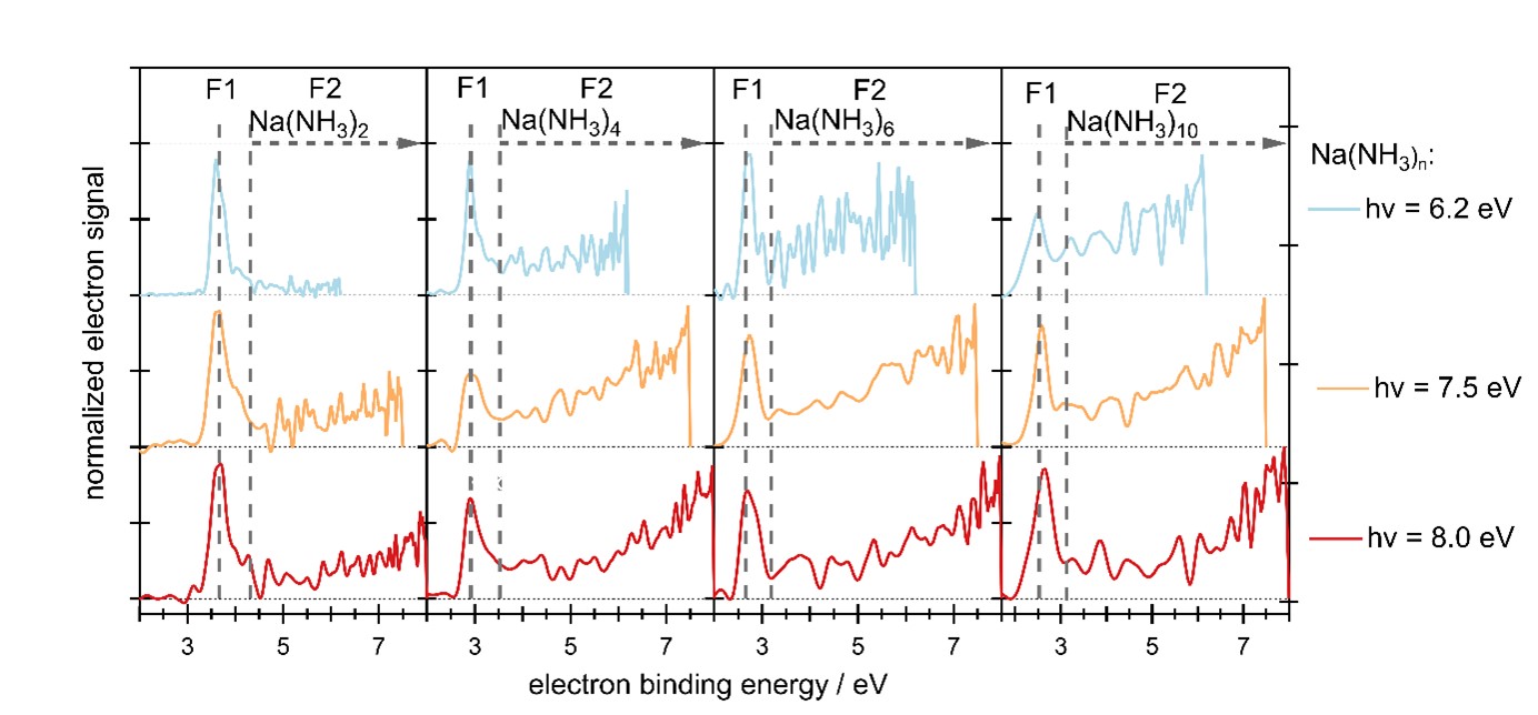 En raison de ce processus, appelé relaxation induite par transfert d'électrons (ETMD, représenté schématiquement à la figure 1C), la signature des diélectrons dans le spectre photoélectronique diffère fortement de la signature des électrons solvatés simples (voir figure 2). Jusqu'à présent, des processus ETMD similaires ont été principalement observés à des énergies de photons beaucoup plus élevées, dans la gamme des rayons XUV à X mous. En accord avec les calculs de chimie quantique, les signatures des diélectrons solvatés ont été observées dans une large gamme d'énergies de photons UV/VUV et pour toutes les tailles de clusters examinées (1-20 molécules d'ammoniac), ce qui suggère que des processus identiques peuvent se produire en phase liquide.