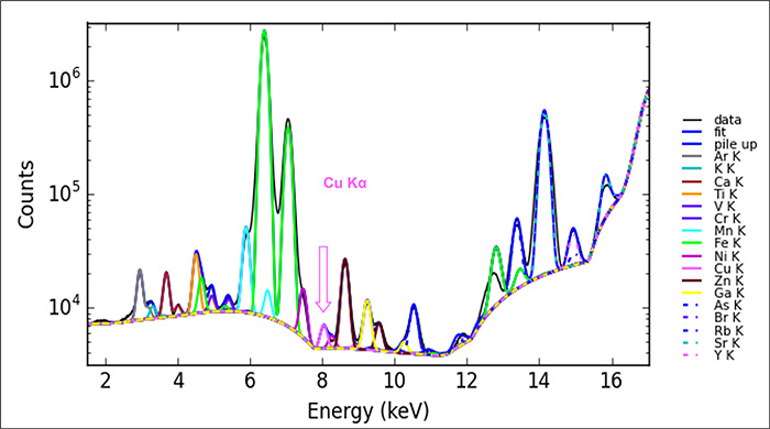 Les mesures de Sy-XRF ont été réalisées sur la ligne de lumière DIFFABS en utilisant un faisceau de rayons X d’une énergie de 18 keV. La taille du faisceau a été réduite à 50 µm grâce à un petit diaphragme en molybdène. Un balayage bidimensionnel rapide de l’outil permet d’obtenir une cartographie sur quasi l’ensemble de l’objet, avec un pas de mesure de 50 µm. Un spectre XRF est acquis pour chaque pixel de la cartographie et analysé pour en déduire les éléments en présence.